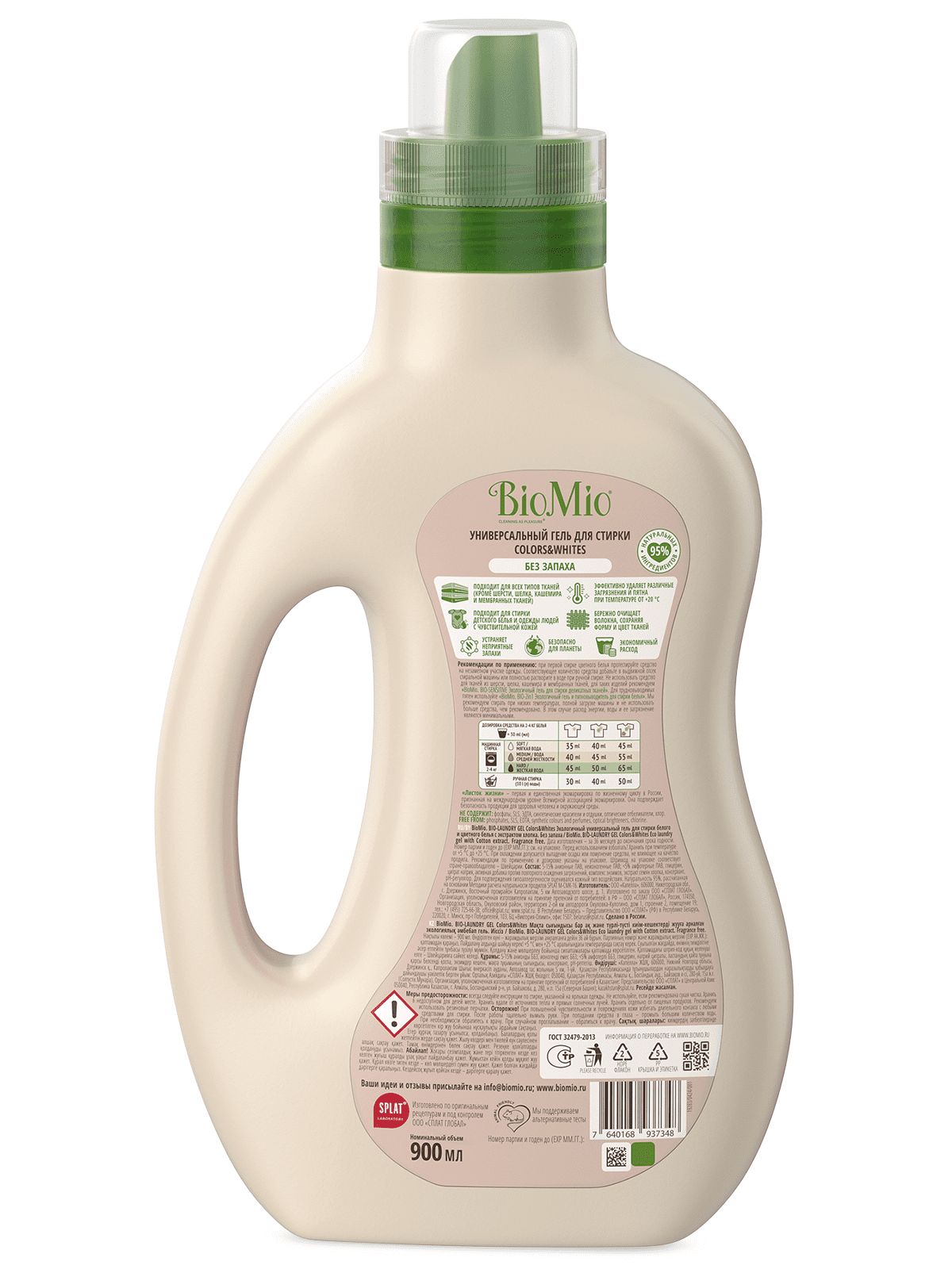 Средство для стирки нового поколения на 95% состоит из натуральных компонентов. Гель клинически протестирован, гипоаллергенен. Подходит для детского белья и одежды людей с чувствительной кожей. Не содержит фосфаты, SLS, ЭДТА, синтетические красители и отдушки, оптические отбеливатели, хлор. Прошел экосертификацию «Листок Жизни». Безопасен для септиков и природы.