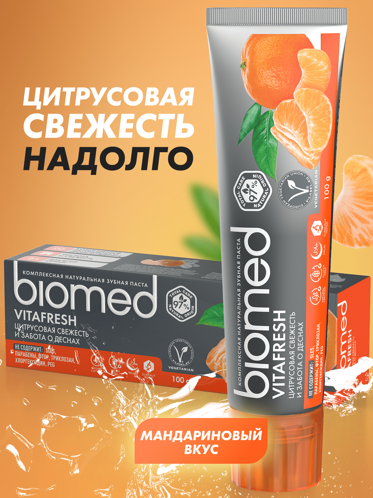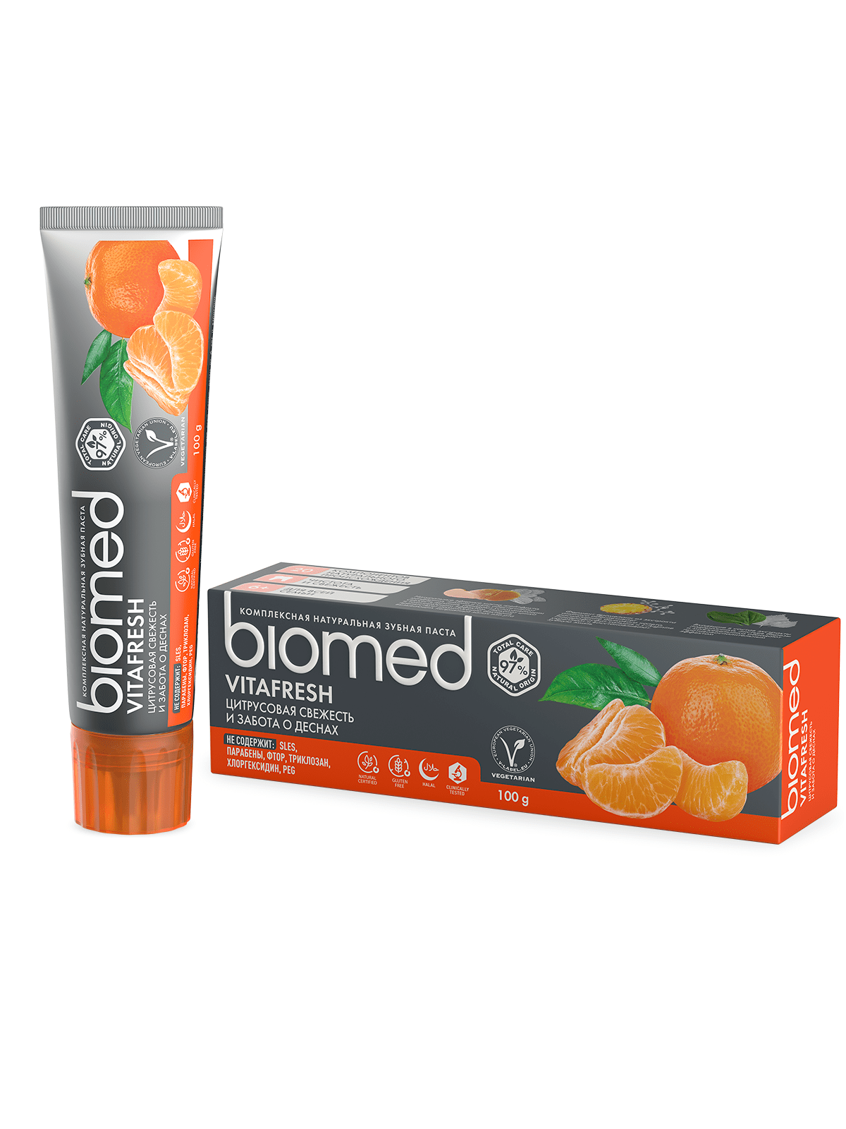 Освежающая натуральная зубная паста Biomed Vitafresh с эфирными маслами цитрусов устраняет причину неприятных запахов во рту и надолго освежает дыхание. На 97% состоит из компонентов природного происхождения: