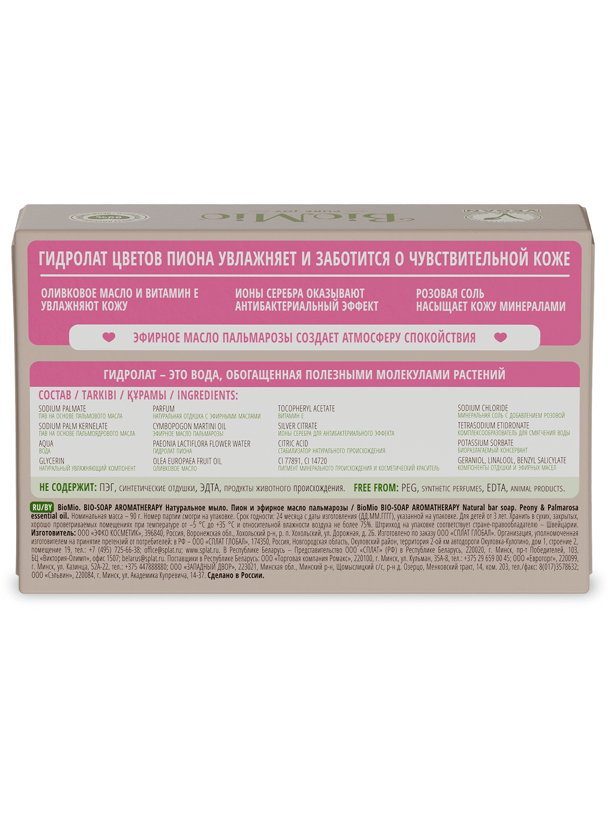Натуральное веганское мыло BioMio AROMATHERAPY заботится о вашей коже и настроении. Эфирное масло пальмарозы превращает каждое мытье рук в сеанс ароматерапии и погружает вас в атмосферу спокойствия. Цветочная вода — гидролат пиона — увлажняет кожу рук. Оливковое масло и витамин Е закрепляют эффект увлажнения. Розовая соль насыщает кожу полезными минералами. Ионы серебра оказывают мягкий антибактериальный эффект. Формула мыла разработана для ухода за чувствительной кожей.