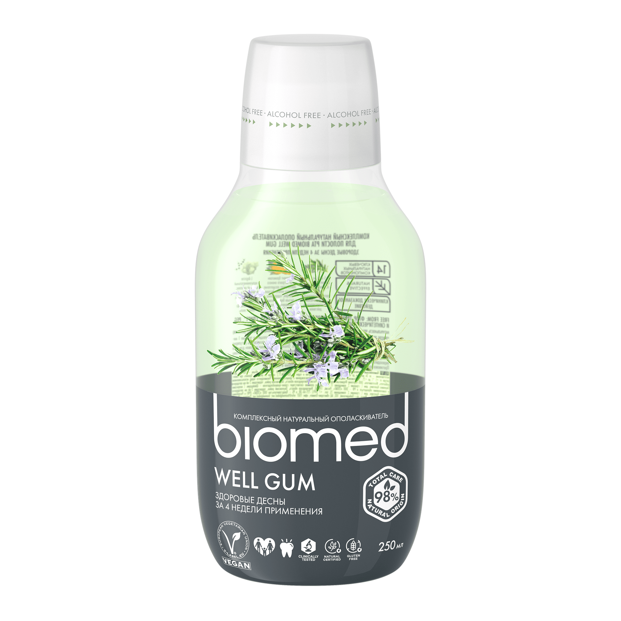 Натуральный комплексный ополаскиватель Biomed Well Gum с приятным мятно-травяным вкусом оздоравливает десны за 4 недели применения. На 99% состоит из компонентов натурального происхождения. Антикариесный и противовоспалительный эффект дают растительные экстракты (шалфея, подорожника, листьев березы). Антиоксидантное и антисептическое действие оказывают 5 эфирных масел (эвкалипта, аниса, кедра, гвоздики, розмарина). Фермент бромелайн расщепляет белковый налет. Рекомендован взрослым и детям от 6 лет (под контролем родителей).