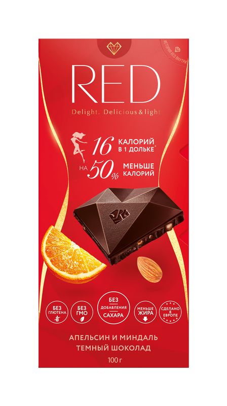 "RED шоколад темный с апельсином и миндалем, без сахара, на 50% меньше калорий, 100 г. Изысканный темный шоколад с кусочками средиземноморского апельсина и калифорнийского миндаля. Яркий насыщенный вкус для ценителей темного шоколада.