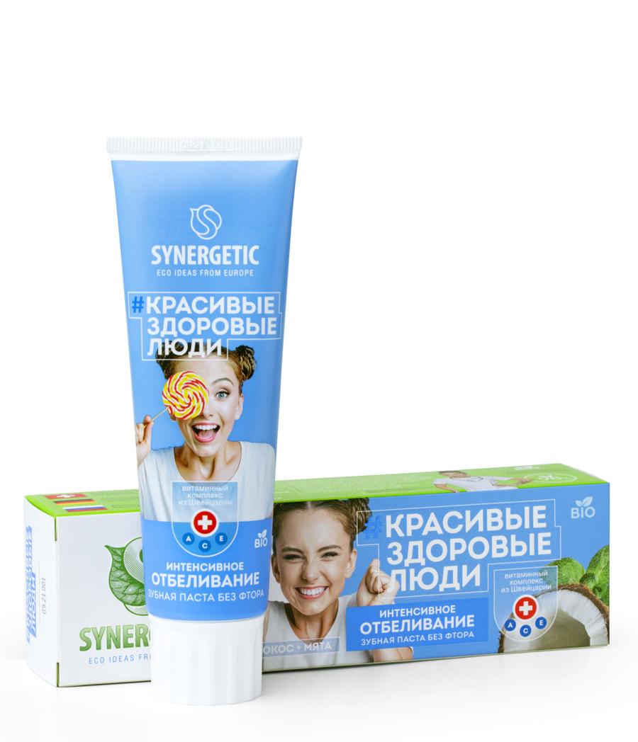 Натуральная зубная паста «Интенсивное отбеливание» SYNERGETIC со вкусом «КОКОС+МЯТА» – безопасная и эффективная паста без фтора, которая расщепляет и удаляет белковую основу окрашенного налета и активно осветляет эмаль. Активные компоненты в этой зубной пасте ― эффективные и безопасные папаин, цитрат цинка и экстракт лимона. Растительные компоненты из Германии и швейцарские витамины A, C, E улучшают обменные процессы и восстанавливают здоровье десен. Цитрат цинка, экстракты аира, лимона и бисаболол оказывают общий тонизирующий и противовоспалительный эффект. Абразив нового поколения с частицами сферической формы и растительный фермент папаин бережно очищают, не повреждая зубную эмаль. Натуральный кристаллический ментол обеспечивает длительную свежесть дыхания. Паста не содержит мела, фтора, SLS, SLES, парабенов, триклозана и диоксида титана.