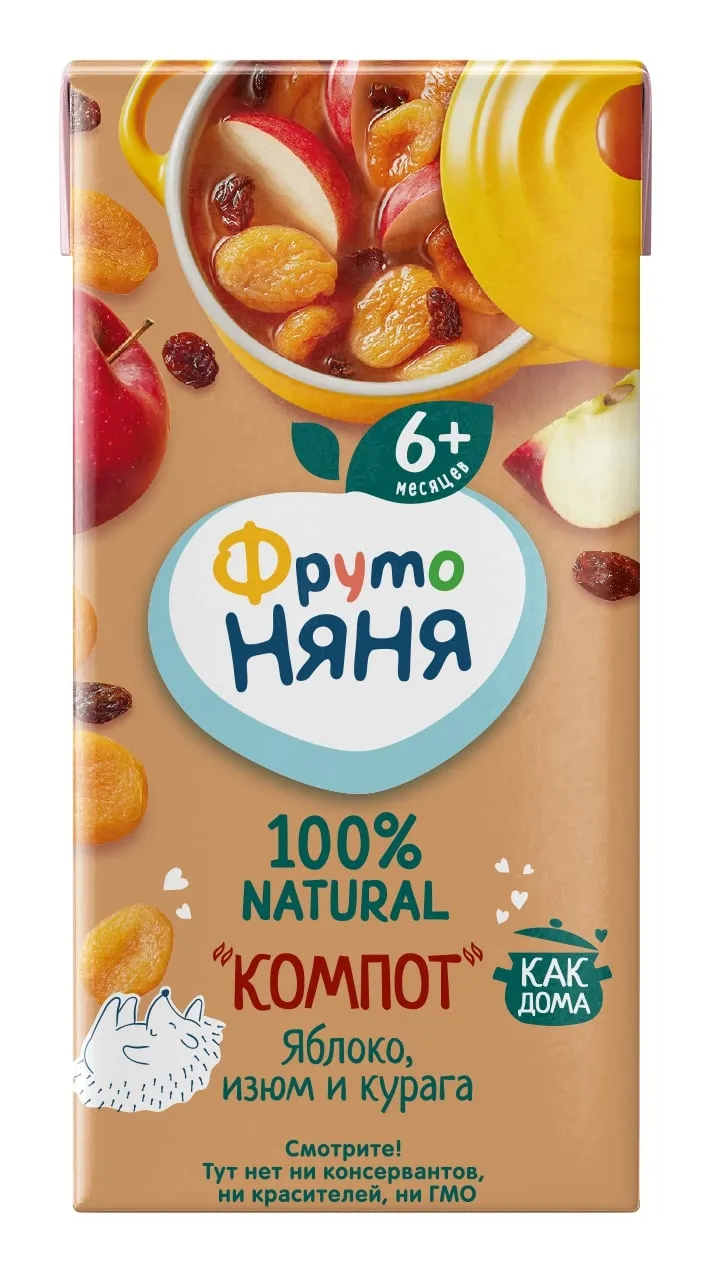 сок из яблок, экстракт из изюма и кураги, вода. Изготовлен из концентрированного сока. Без добавления сахара. Содержатся сахара природного происхождения. Объемная доля сока не менее 70%.