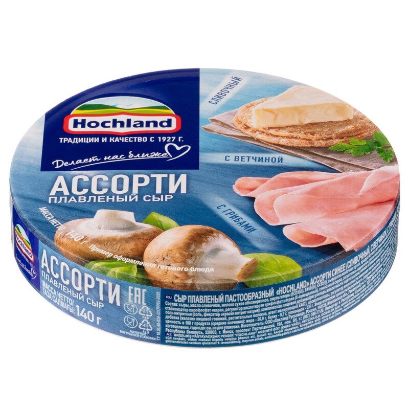 Плавленый сыр Hochland Ассорти Синее в кругах обладает самым большим разнообразием вкусов. В Ассорти Синее собраны самые популярные и любимые треугольники: нежный сливочный, с ветчиной и с грибами. Каждый треугольник плавленого сыра герметично упакован в фольгу. Разнообразие любимых вкусов плавленого сыра всегда под рукой благодаря удобной упаковке, которую легко взять с собой.