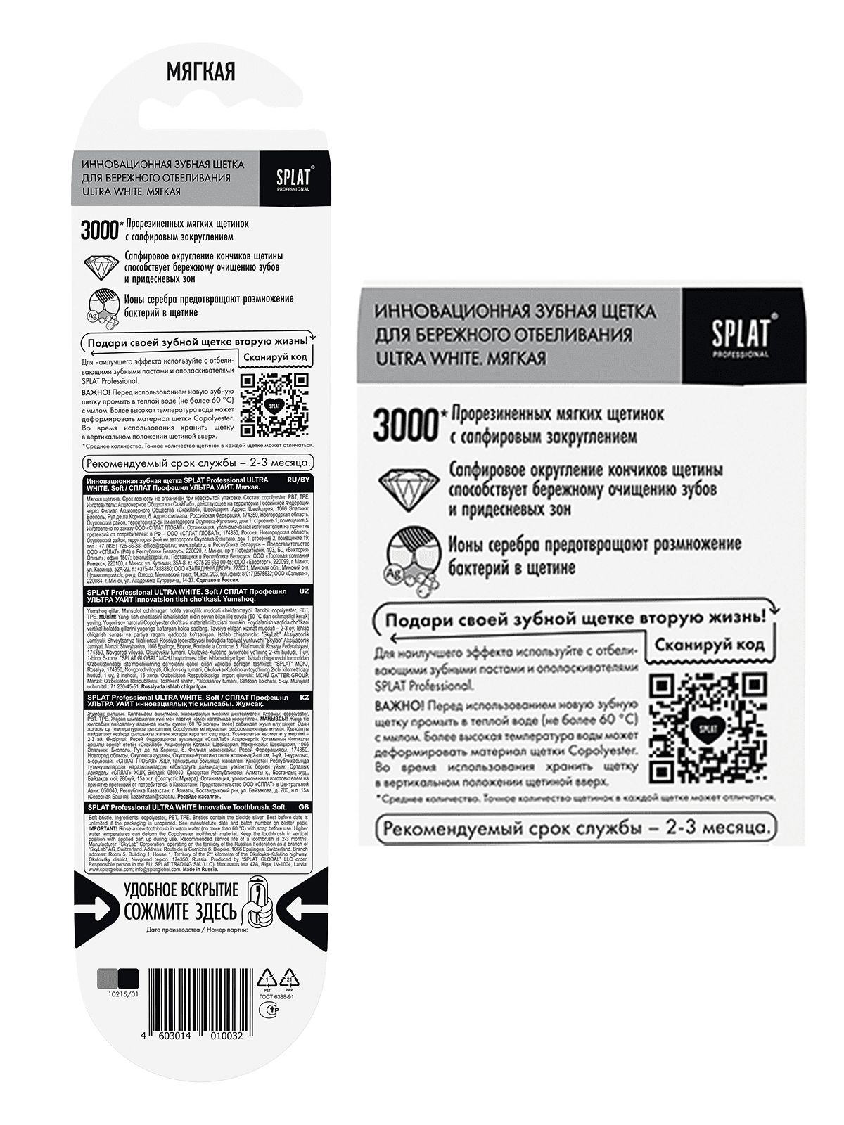 Перед использованием новую зубную щетку промыть в теплой воде с мылом. Во время использования хранить щетку в вертикальном положении щетиной вверх. Для наилучшего эффекта используйте с отбеливающими зубными пастами и ополаскивателями SPLAT Professional.