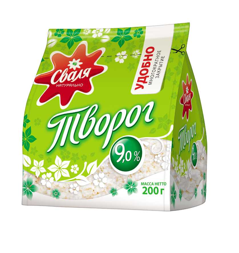 СВАЛЯ - это стабильное и неизменно высокое качество продуктов.Творог СВАЛЯ произведен из натурального молока и закваски. Творог 9% имеет рассыпчатую деликатную зернистую структуру. Идеально подходит для всех, кто ценит насыщенный традиционный вкус творога. Благодаря современной герметичной упаковке творог сохраняет свежесть и прекрасный вкус в течение 30 суток. Мы позаботились о том, чтобы Вы насладились нашим продуктом много дней подряд: благодаря клейкой ленте на упаковке, можно многократно открывать и закрывать упаковку, не боясь, что качество продукта изменится на следующий день. Творог СВАЛЯ прекрасно дополнят ягоды, мёд и орехи. Он идеален как самостоятельное блюдо и как основа для приготовления Ваших любимых блюд. Творог т.м. СВАЛЯ 9% доступен в упаковках 200 г, 400 г и 700 г.