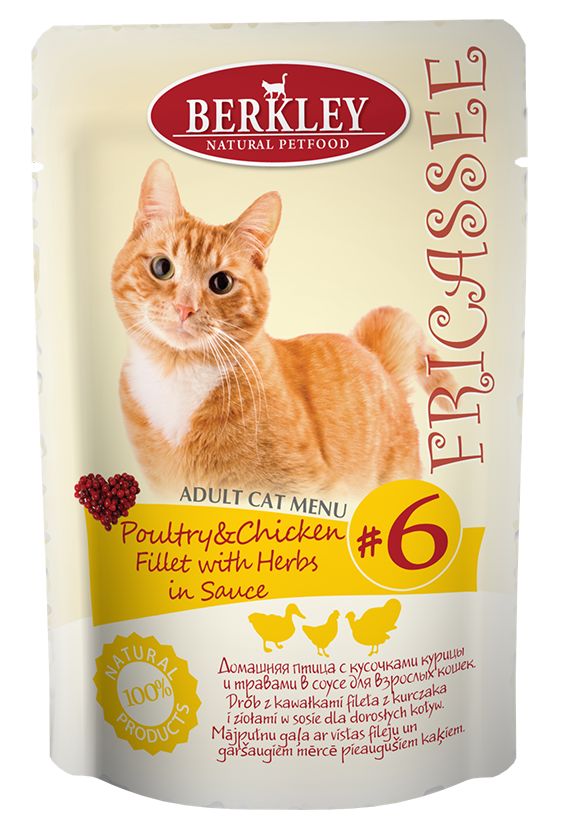 Корм для взрослых кошек Фрикасе домашняя птица с кусочками курицы и травами в соусе Berkley