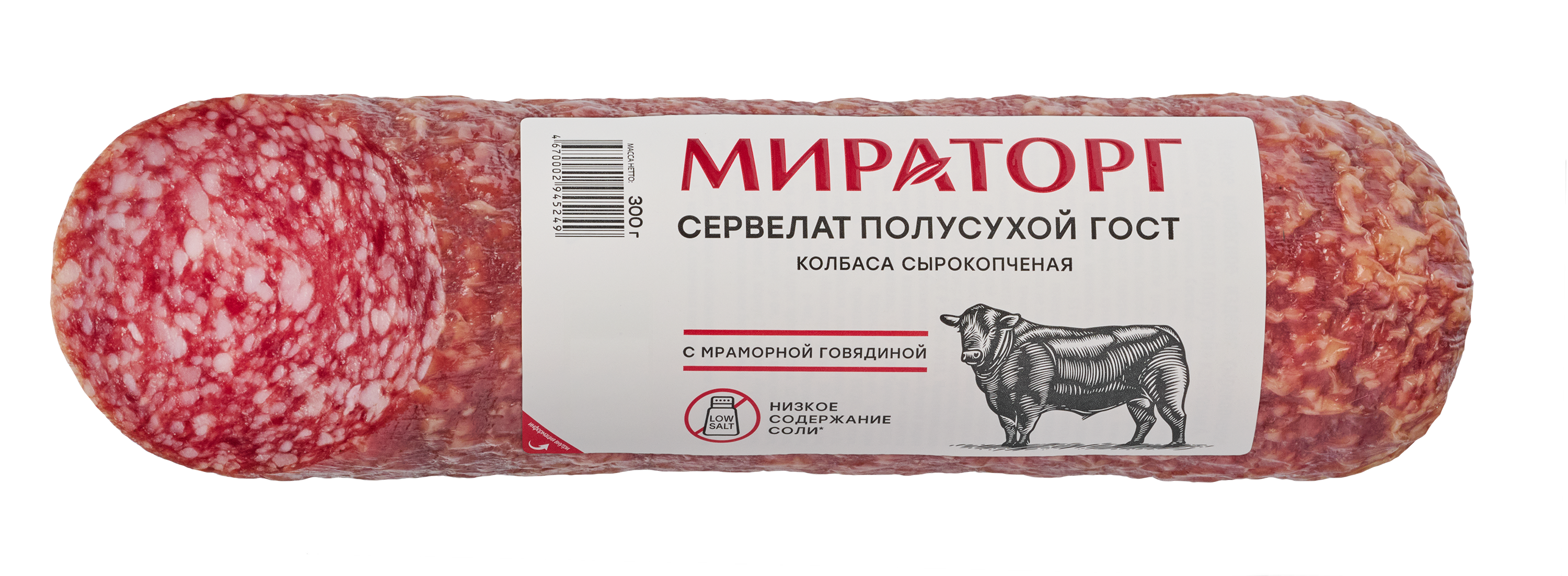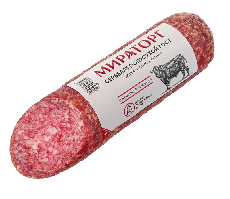 Сырокопченая колбаса "Сервелат" Мираторг приготовлена строго по ГОСТу из мяса собственного производства: отборной свинины, мраморной говядины Black Angus и натурального шпика с добавлением пряного мускатного ореха и душистого белого перца. Отличается зернистой структурой с мелкими кусочками шпика на срезе.