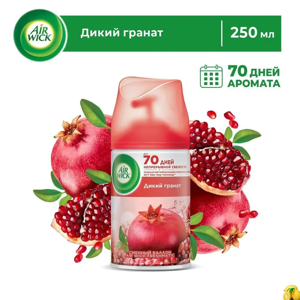 Сменный баллон Air Wick Freshmatic Дикий гранат, для автоматического аэрозольного освежителя воздуха, 250 мл избавляет от неприятных запахов и наполняет дом приятным ароматом. Наполните дом освежающими нотками сочного манго с Air Wick Дикий гранат.