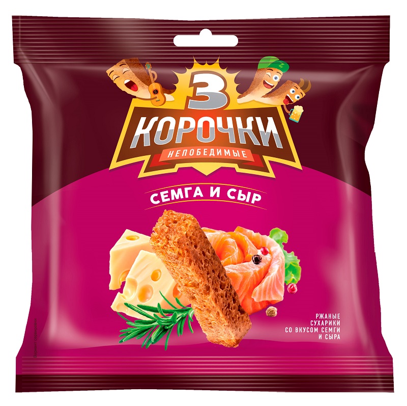 Ржаные сухарики со вкусом сыра и семги. Для «3-х Корочек» используется свежеиспеченный хлеб. Сухарики производят без обжарки во фритюре. Современная технология сохраняет полезные свойства злаковых культур и обеспечивает сухарикам незабываемый вкус.