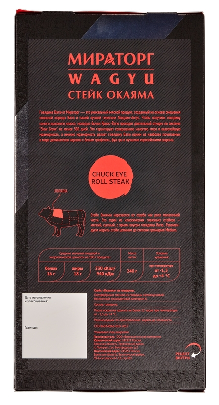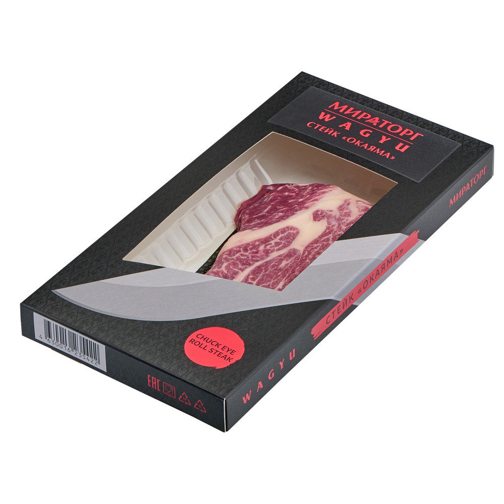 Стейк Окаяма нарезается из отруба чак ролл. Это один из классических говяжьих стейков – мягкий, сытный, с ярким вкусом говядины Вагю. Рекомендуем жарить стейк целиком до степени прожарки Medium.
