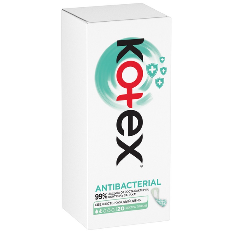 Kotex® Antibacterial (Антибактериал) – это абсолютная инновация в категории ежедневных прокладок! Новые ежедневные прокладки от Kotex® созданы специально для потребностей современных девушек, которые хотят быть уверены в своей защите и отсутствии неприятного запаха. Благодаря наличию специального антибактериального слоя внутри прокладки новые Котекс® Antibacterial обеспечивают 99% защиту от роста бактерий* и контроль запаха: компоненты антибактериального слоя воздействуют на бактерии, вызывающие неприятный запах, не давая им размножаться. Антибактериальный слой находится внутри прокладки, не соприкасаясь с V-зоной и не воздействуя на неё. Ежедневные прокладки экстра тонкие, ~1мм в толщину, что позволяет коже дышать и обеспечивает комфорт и свежесть на протяжении всего дня. Благодаря специальной форме прокладки её можно использовать с любым типом белья. *Специальный антибактериальный слой внутри прокладки препятствует росту 99% бактерий, которые могут вызывать неприятный запах (Staphylococcus aureus, E.coli). Протоколы исследований SGS Report VA/2017/93213B-02 and SGS Report VA/2019/A1768F-001. Антибактериальное действие происходит только внутри прокладки.