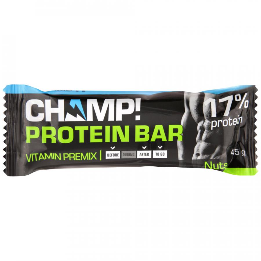 Батончик СHAMP! это высокопротеиновый полезный перекус с насыщенным ореховым вкусом. В составе продукта 17% высококачественного животного и растительного белка, аминокислотный состав которого является важнейшей составляющей ежедневного рациона. Кроме того, в батончике содержится комплекс из 10 витаминов, специально подобранных для улучшения ваших спортивных результатов.