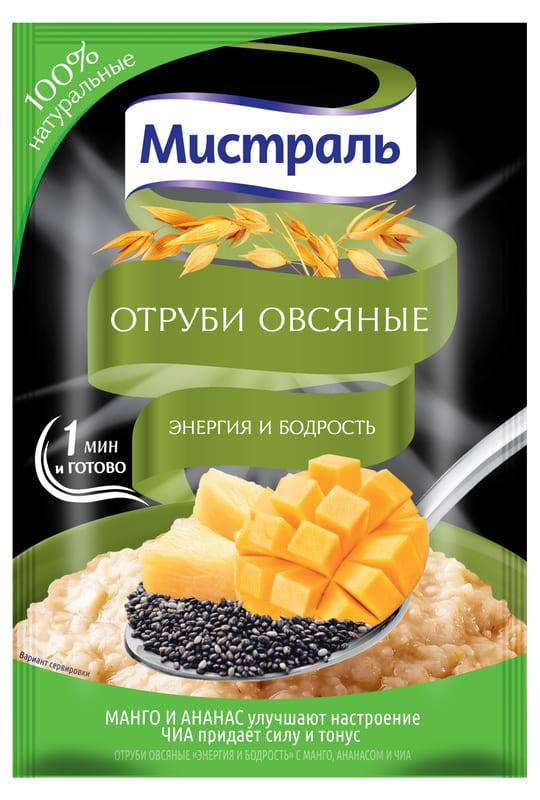отруби овсяные, фруктоза, манго сушеное резаное панированное рисовой мукой, мука из семян чиа, папайя, соль поваренная пищевая выварочная, ароматизатор пищевой натуральный "Со вкусом манго", подсластитель экстракт стевии. Продукт может содержать следы арахиса, орехов, молока, кунжута и продуктов их переработки.