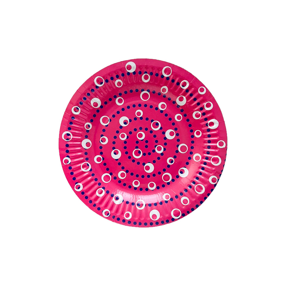 Бумажная тарелка. Используется совместно с другими элементами коллекции по дизайну (салфетки, приборы, скатерти и т.п.) как украшение стола или по своему непосредственному назначению.