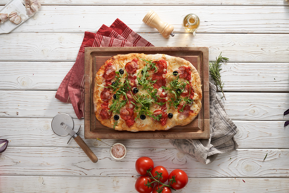 Сыр Моцарелла, Основа для римской пиццы, Масло оливк, Грибы шампиньоны, Кетчуп, Курица грудка Су Вид, Майонез 67%, Огурцы маринованные