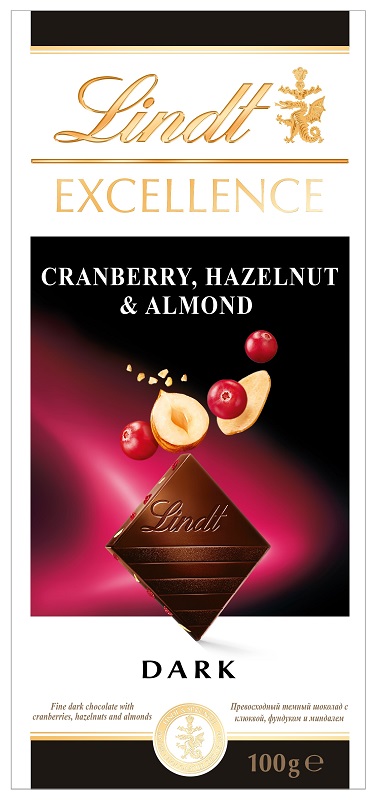 Превосходный горький шоколад с клюквой, миндалем и фундуком. Откройте для себя непревзойденный темный шоколад Lindt Excellence - Отборные ингредиенты и какао-бобы высокого качества