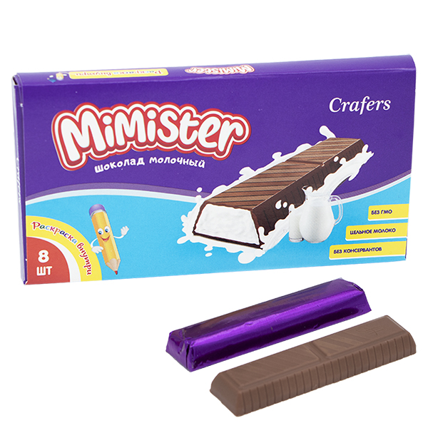 Шоколад молочный Mimister кремовая начинка. Вкусный, нежный молочный шоколад с молочной начинкой. Высокое содержание молока (27%). В индивидуальных стиках. Удобно взять с собой, дать ребенку для перекуса. Раскраска внутри