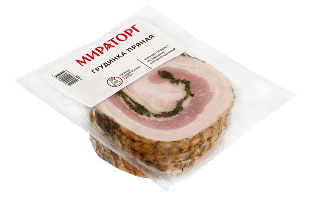 Копчено-вареная грудинка поркетта торговой марки «Мираторг» производится по традиционному рецепту с использованием высококачественных ингредиентов. В составе продукта — свинина, выращенная на собственных животноводческих участках. Деликатес представляет собой мясной рулет с чесноком, зеленью и специями, вкус и пряный аромат которого оценят даже гурманы. Грудинку можно подавать к праздничному столу в составе тарелки с мясной нарезкой, а также готовить из нее сэндвичи.