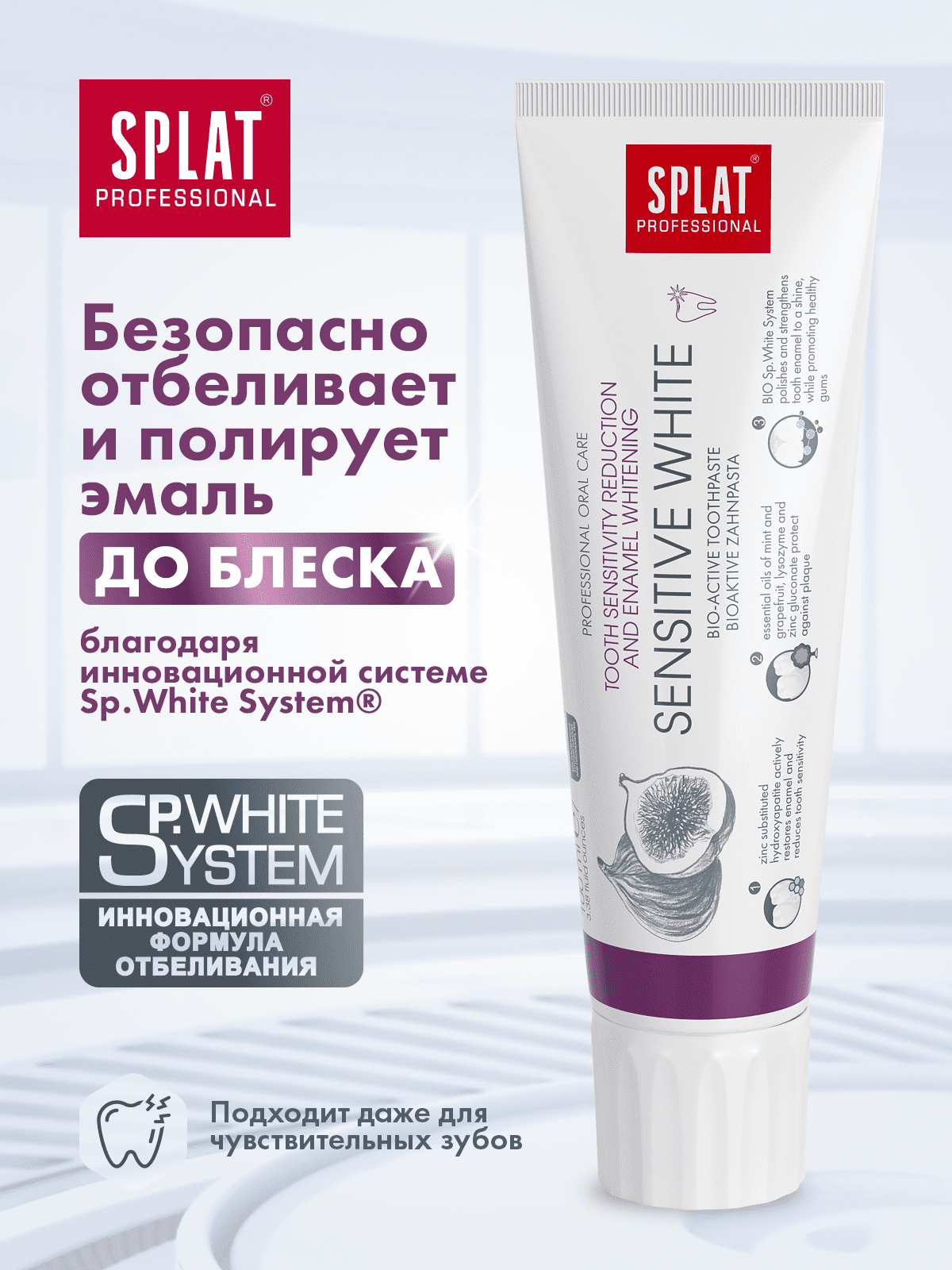 Зубная паста SPLAT Professional «Сенситив Отбеливание» (SENSITIVE WHITE) с инновационным комплексом Sp.White System бережно осветляет эмаль чувствительных зубов. Фермент танназа расщепляет окрашенные вещества на эмали. Пирофосфаты кальция и натрия интенсивно счищают налет, а эфирные масла мяты, грейпфрута и глюконат цинка не дают ему вновь образовываться. Экстракт инжира оказывает антиоксидантное и антибактериальное действие. Природный белок лизоцим активно защищает от бактерий. Экстракт бифидобактерий поддерживает баланс микрофлоры в полости рта.