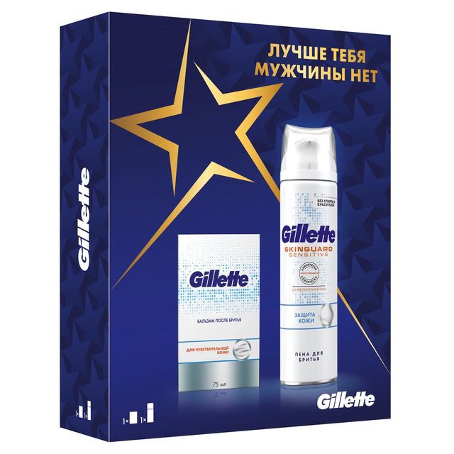 Сделайте ему подарок, который он оценит! В набор входят пена для бритья Gillette Skinguard Sensitive для чувствительной кожи с экстрактом алоэ Защита кожи 250 мл и бальзам после бритья Gillette для чувствительной кожи 75 мл.