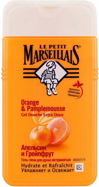 Гель для душа увлажняющий Le Petit Marseillais BIO Грейпфрут и Апельсин предназначено для кожи тела 250 мл. Гель-пена для душа создана специально для мягкого очищения кожи. С помощью геля для душа Le Petit Marseillais вы сможете превратить принятие ванны или душа в момент истинного удовольствия. С помощью легко смывающегося геля для душа можно образовать душистую пену, наполненную насыщенным солнечным ароматом. Гель для тела увлажняет, освежает, имеет ph нейтральный, а флакон является на 100% биоразлагаемым. Воздушная и легко смывающаяся пена средства для душа оставляет аромат. Средство имеет приятный запах и оставляет на коже восхитительный аромат. Гель для тела мягко очищает вашу кожу, легко и быстро смывается, оставляя на коже восхитительный аромат. Способ применения: нанести на влажное тело, вспенить и смыть.Средство для душа протестировано дерматологами.
