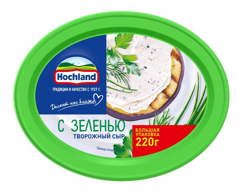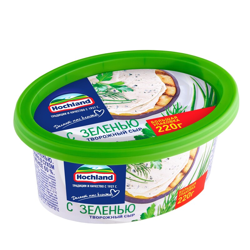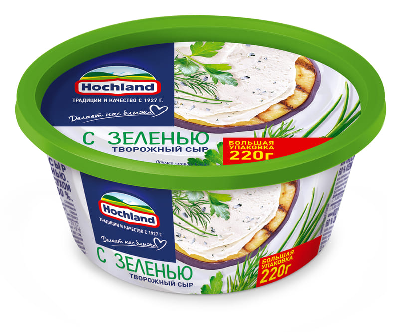 Сыр творожный Hochland с зеленью – нежный продукт, сочетающий в себе вкус сливочного творога и молодого сыра с пикантной ноткой свежей зелени. Готовится он из натурального молока и отлично подходит для всей семьи. Сыр обладает приятной консистенцией и легко намазывается на хлеб, горячие тосты и хрустящие крекеры. Он идеален для дополнения как классических бутербродов, так и более интересных блюд - блинчиков, равиоли, творожно-сырной лепешки.