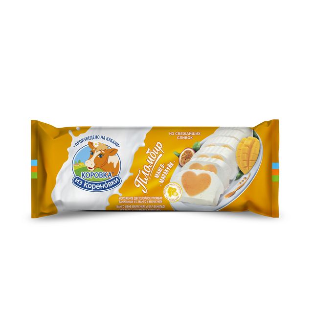 Мороженое «Пломбир» выпускается под брендом «Коровка из Кореновки» и объединяет два ключевых ингредиента — двухслойную ваниль и манго-маракуйя. Последний компонент представлен в виде фруктового пюре. Благодаря такому сочетанию удается достичь приятного вкуса, который наилучшим образом раскрывается в жаркое время года. Продукт отличается продолжительным сроком годности при соблюдении правил хранения.