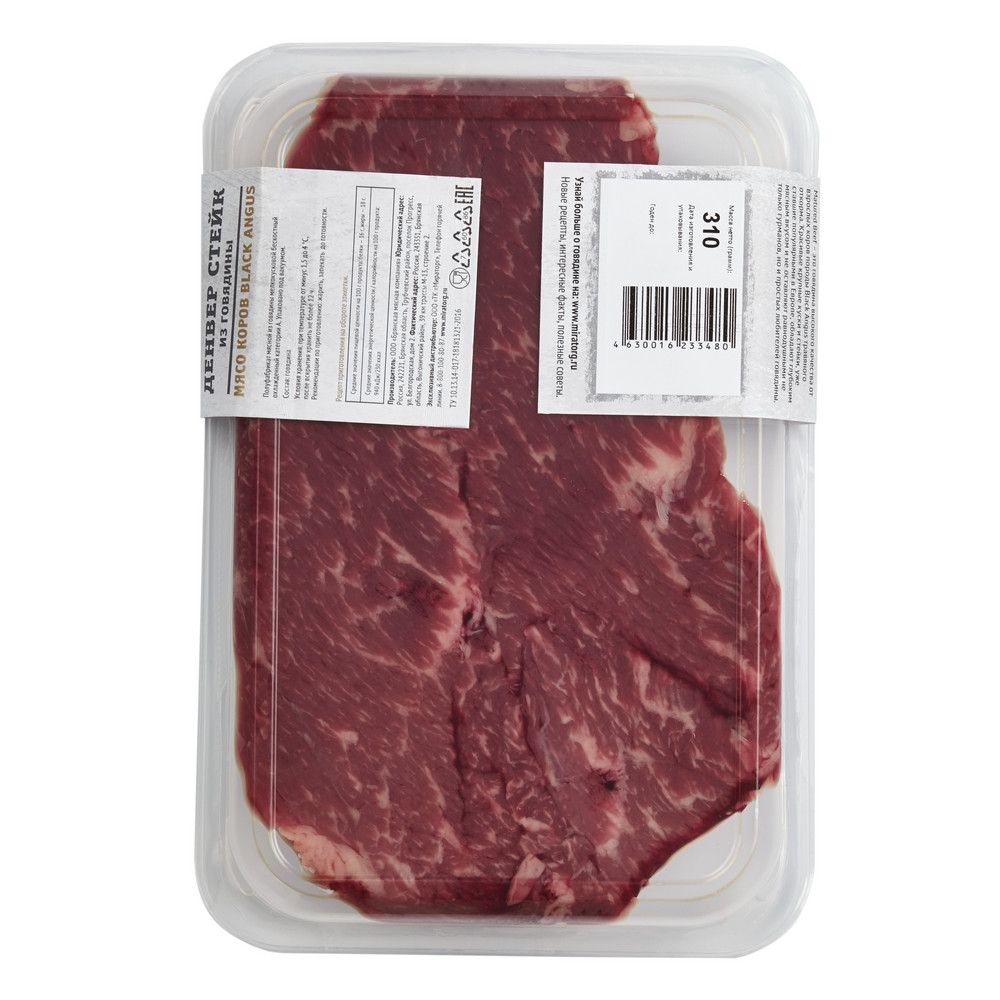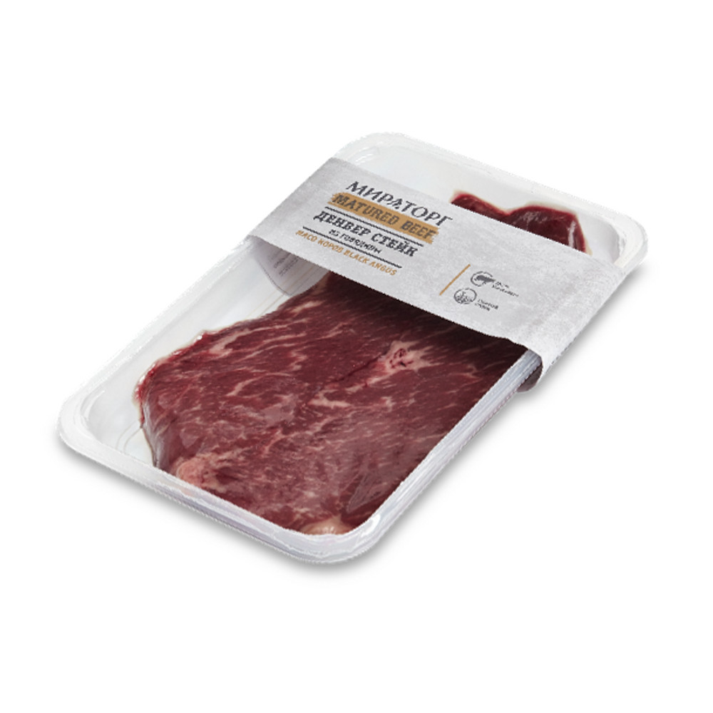 Стейк из говядины Matured Beef от коров породы Black Angus. Денвер стейк нарезается из филе шейного отруба и обладает высокой мраморностью. Среди прочих стейков Денвервыделяется своей необычной продолговатой формой и крупными волокнами. Вкусовые качества мяса лучше всего раскрываются при прожарке Medium