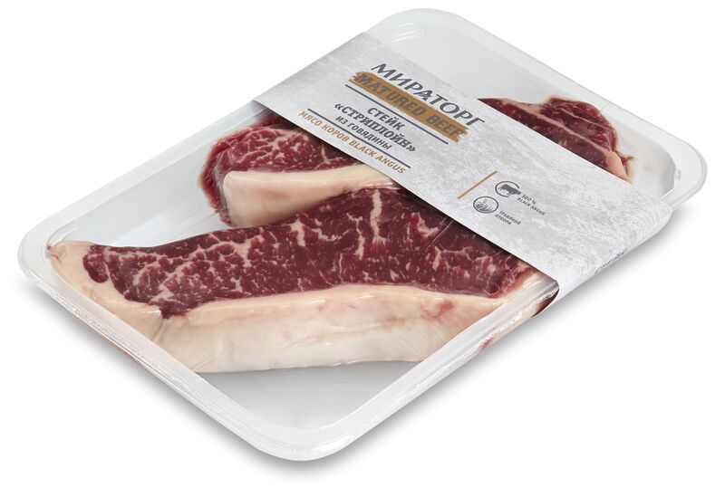 Стейк стриплойн, который еще называют Нью-Йорк или Канзас, нарезают из тонкого края мраморной говядины грейда Prime с прослойкой жира по краю. Высокая мраморность мяса обеспечивается 250-дневным зерновым откормом.