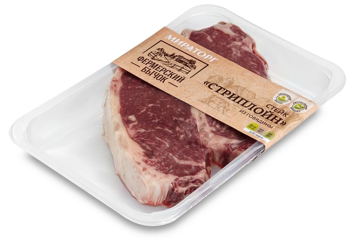 Денвер стейк выделяется из филе шейного отруба и состоит из цельной мышцы без жил. Относится к альтернативным стейкам. Обладает высокой мраморностью, благодаря чему стейк сочный и нежный. На обратной стороне этикетки указан простой и легкий рецепт приготовления стейка, а также полезная информация.
