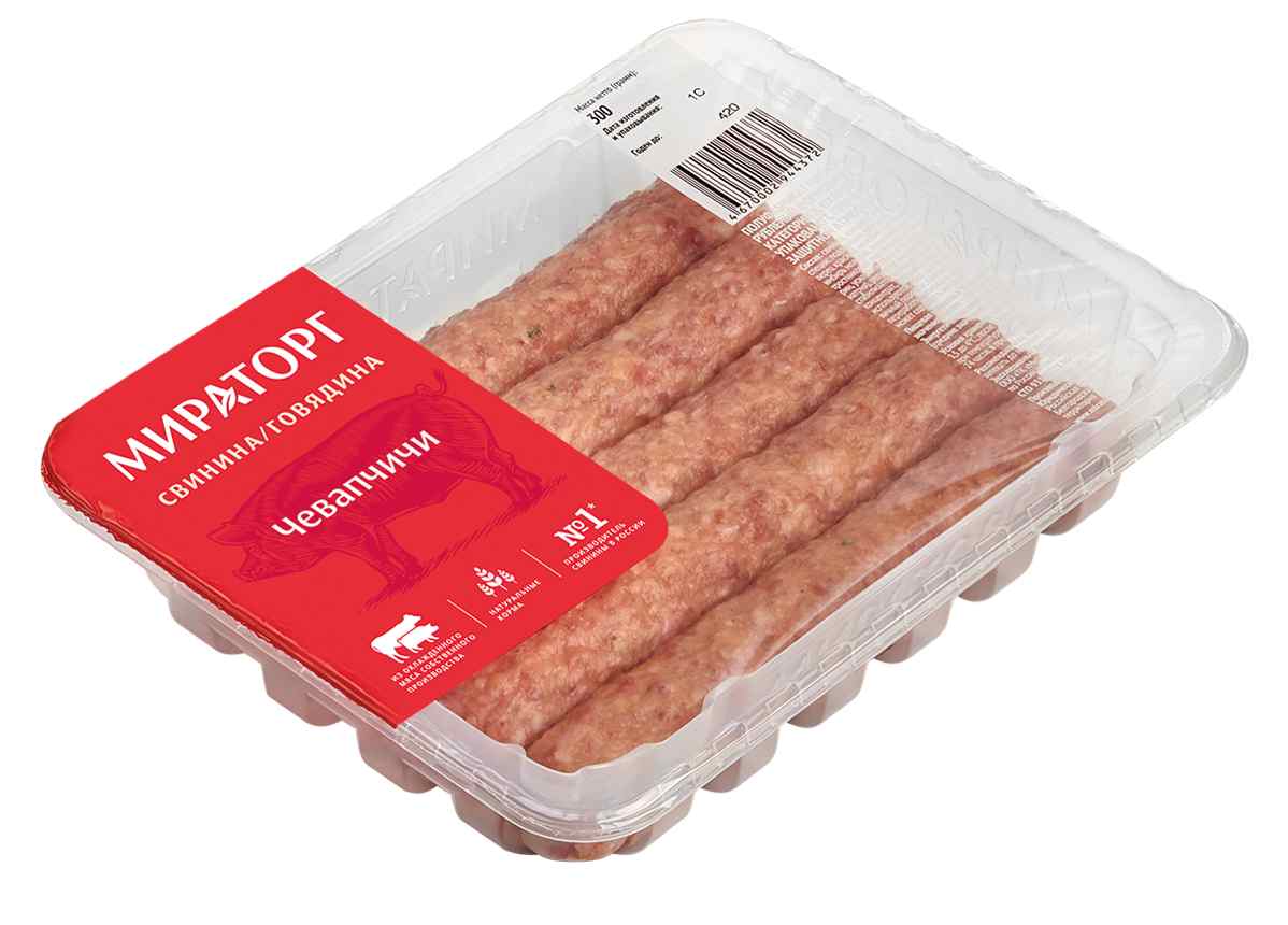 Колбаски "по-домашнему" чевапчичи - колбаски без оболочки. В отличие от других колбасок Мираторг Чевапчичи производятся с гораздо более мелкой рубкой. Тем не менее они не менее вкусные и сочные, как и весь ассортимент колбасок Мираторг. Классическийбалканский рецепт - свинина, говядина, лук, перец, паприка.