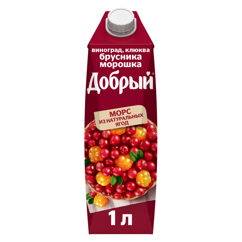 Добрый морс Виноград-клюква-брусника-морошка без добавления консервантов и красителей в удобной упаковке для семейного обеда или ужина.